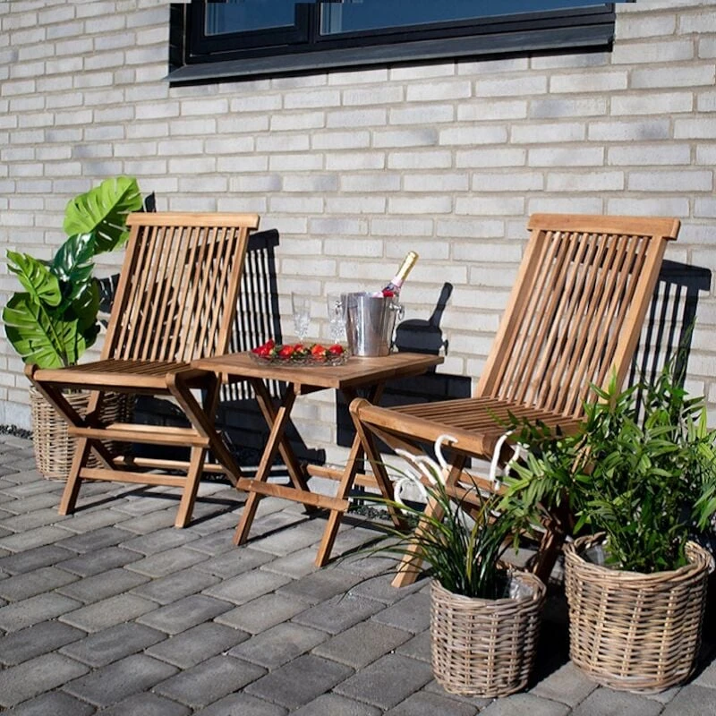 Laadukkaasta tiikkipuusta valmistettu parvekesetti. Sisältää pienen pöydän ja kaksi siroa tuolia. Tiikki on materiaalina hyvin kestävä ja se kestää erilaiset säänvaihtelut, sekä kuumuuden ja lämpötilojen vaihtelun. Näiden tuotteiden tiikki on peräisin Indonesiasta ja sillä on Flegt-sertifikaatti, mikä tarkoittaa, että puut on kaadettu laillisesti. Sävy on kauniin kullanruskea, joka tuo ulkotilojen sisustukseen kodikasta tunnelmaa. Sijoita parvekesetti mukavaan paikkaan, jossa on hyvä nauttia kesän lämmöstä. Tuolit ja pöytä ovat taitettavia, joten ne vievät säilytyksessä vain vähän tilaa.
